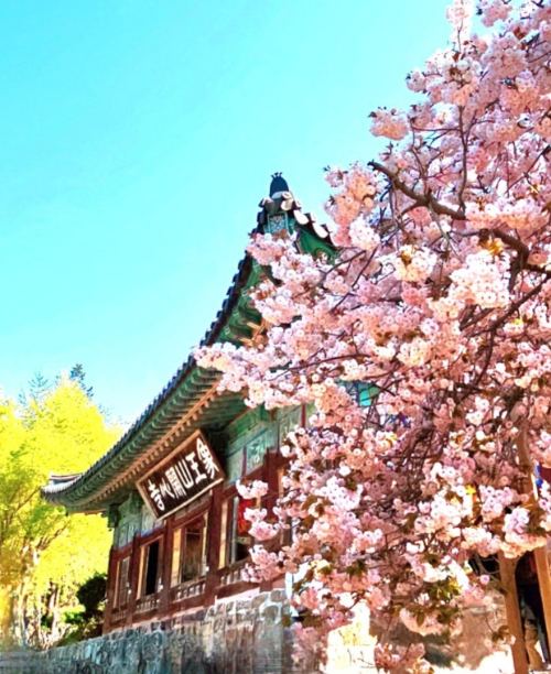 분홍빛 구름이 사찰 곳곳을 뒤덮은 듯한 풍경에